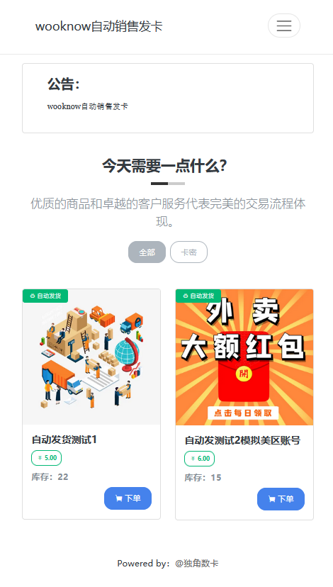 就是在线卖虚拟产品的平台。像这种发卡平台大家应该都见过,一些软件、激活码、会员等虚拟产品都可以放到这上面来出售。我这使用的发卡项目是开源的 独角数卡,界面和功能都很符合我口味,挺不错的。而且这里的支付功能我也已经接入,是可以下单付款的。有兴趣的,可以付款体验一下。